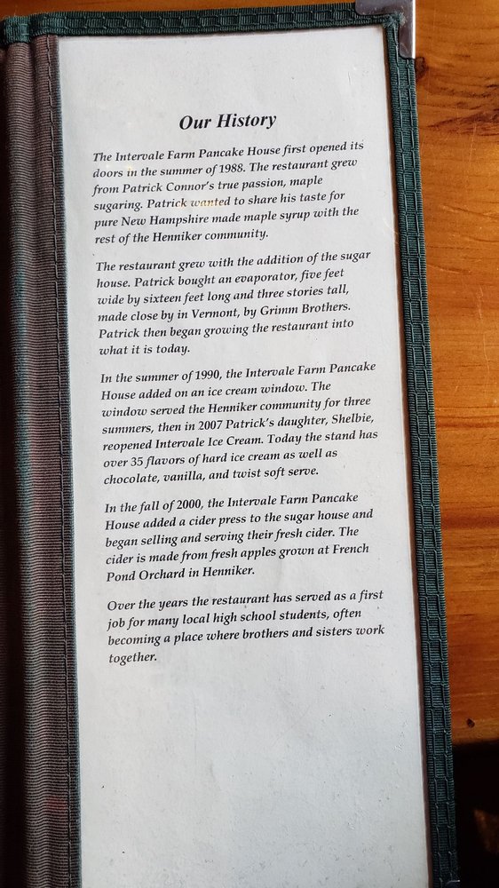 Introducing the Intervale Farm Pancake House, a delightful breakfast and brunch spot in Henniker, NH. With a charming ambiance and friendly service, this restaurant offers a range of delicious dishes like blueberry pancakes, French toast, and freshly made maple syrup. Customers rave about the great food, fast service, and cozy atmosphere. The menu includes options for groups, kids, and even catering. Don't miss out on the breakfast burritos and sausage, with fresh blueberries in the pancakes. With options for takeout, delivery, and outdoor seating, this is the perfect spot to start your day in the Henniker area. Experience the warmth and satisfaction of a meal at Intervale Farm Pancake House, where every bite feels like a taste of home.